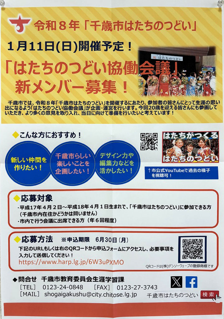 【参加費】 無料(概ね15歳~25歳の方) ※一般観覧はどなたでも申込不要でご参加いただけます。 【定員】 30名 【申込・問合せ】 千歳市教育委員会教育部生涯学習課社会教育係