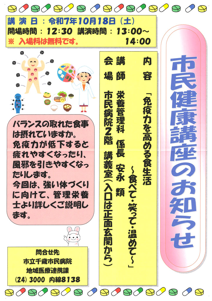 詳細: | ~食べて・笑って・温めて~ バランスの取れた食事は摂れていますか。 免疫力が低下すると疲れやすくなったり、風邪を引きやすくなったりします。 今回は、強い体づくりに向けて、管理栄養士より詳しくご説明します。 【講師】 栄養管理課 係長 安永 類 氏 【入場料】 無料 【問合せ】 市立千歳市民病院 地域医療連携課 電話:0123-24- 3000 内線8138 |