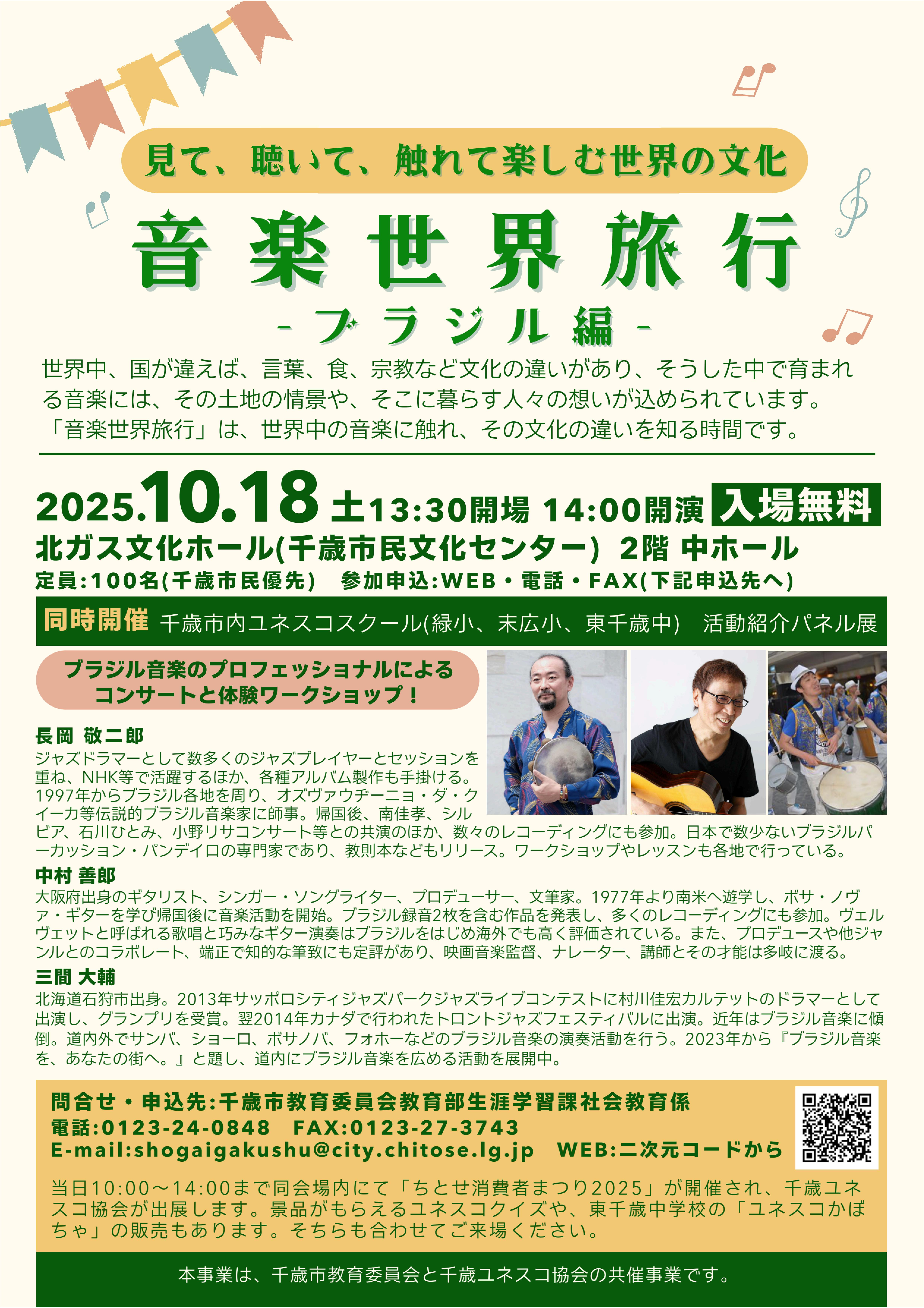 今年度は、「音楽世界旅行-ブラジル編-」と題し、ブラジル音楽の実演及び楽器演奏体験ワークショップを通して、ブラジル文化を知る機会といたします。 【講師】 長岡 敬二郎 氏 中村 善郎 氏 三間 大輔 氏 ※詳細は主催者WEBページ(リンク)をご覧ください 【入場料】 無料 【申込】 千歳市教育委員会生涯学習課社会教育係 電話:0123-24-0848 FAX:0123-27-3743 WEB申込(リンク) 【主催】 千歳市教育委員会 千歳ユネスコ協会 |