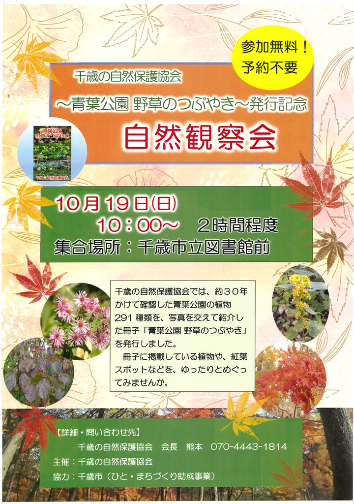 詳細: | 千歳の自然保護協会では、約30年 かけて確認した青葉公園の植物 291種類を、写真を交えて紹介し た冊子「青葉公園 野草のつぶやき」 を発行しました。 冊子に掲載している植物や、紅葉 スポットなどを、ゆったりとめぐっ てみませんか。 【参加費】 無料 【申込】 不要 【詳細・問合せ】 千歳の自然保護協会 会長 熊本