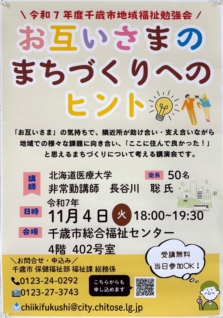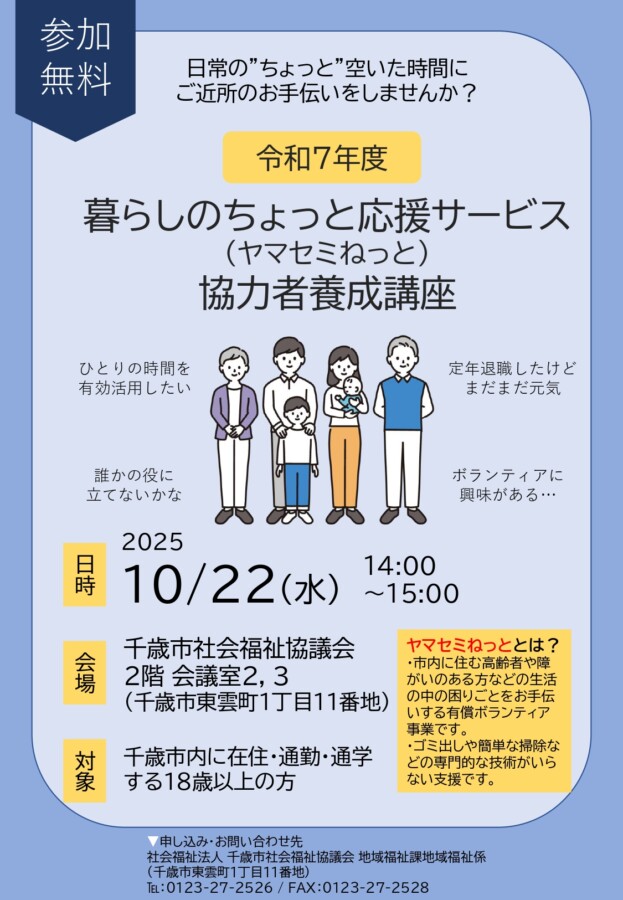 【参加費】 無料 【問合せ・申込】 千歳市社会福祉協議会