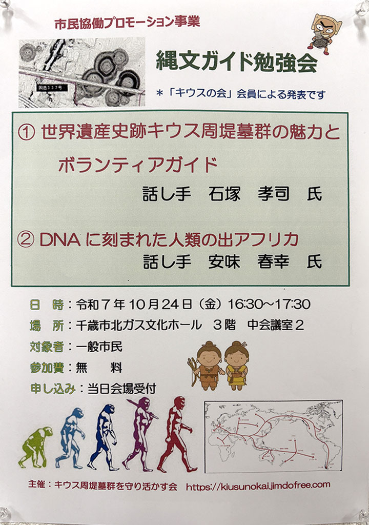 詳細: | 「キウスの会」会員による発表です (1)世界遺産史跡キウス周堤墓群の 魅力とボランティアガイド 話し手:石塚 孝司 氏 (2)DNAに刻まれた人類の出アフリカ 話し手:安味 春幸 氏 【対象】 一般市民 【参加費】 無料 【申込】 当日会場にて受付 【主催】 キウス周堤墓群を守り活かす会 |