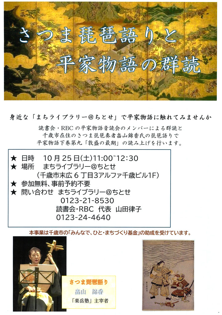 詳細: | 身近な「まちライブラリ―@ちとせ」で平家物語に触れてみませんか 読書会・RBCの平家物語音読会のメンバーによる群読と千歳市在住のさつま琵琶奏者畠山錦香氏の琵琶語りで平家物語下巻第九「敦盛の最期」の読み上げを行います。 【参加費】 無料 (事前予約不要) 【問合せ】 まちラブラリー@ちとせ 0123-21-8530 読書会・RBC 本を読もう会 代表 山田律子 |