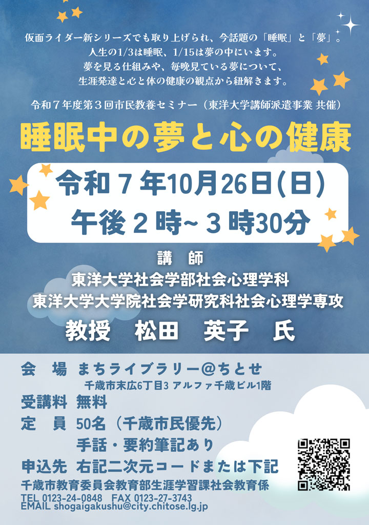【定員】 50名 (千歳市民優先)東洋大学社会学部社会心理学科 東洋大学大学院社会学研究科社会心理学専攻 ※手話・要約筆記あり 【受講料】 無料 【申込方法】 電話・FAX・メール・WEBで申し込み 【申込・問合せ】 |