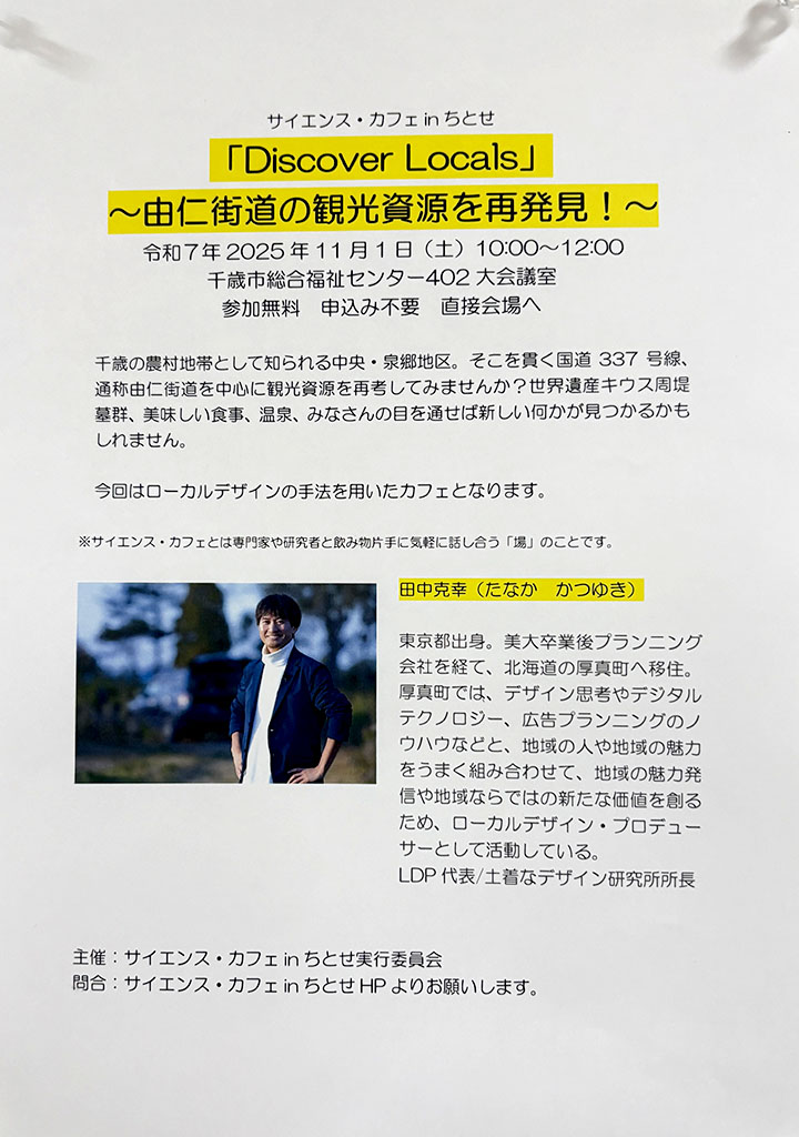 詳細: | 千歳の農村地帯として知られる中央・泉郷地区。 そこを貫く国道337号線、通称由仁街道を中心に観光資源を再考してみませんか? 世界遺産キウス周堤墓群、美味しい食事、温泉、みなさんの目を通せば新しい何かが見つかるかもしれません。 今回はローカルデザインの手法を用いたカフェとなります。 【講師】 田中 克幸 氏 【参加費】 無料 (申込不要 ) 【主催】 サイエンス・カフェ in ちとせ実行委員会 主催者WEBサイト(リンク) |