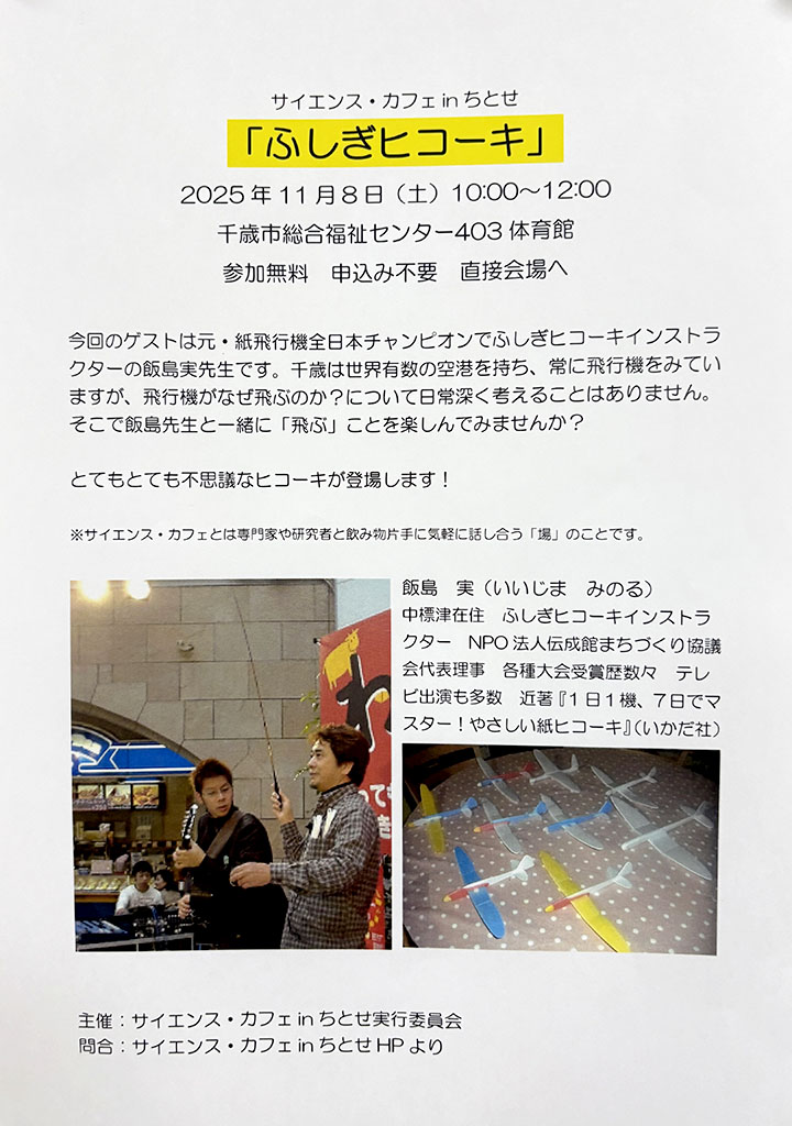 詳細: | 今回のゲストは元・紙飛行機全日本チャンピオンでふしぎヒコーキインストラクターの飯島実先生です。 千歳は世界有数の空港を持ち、常に飛行機を見ていますが、飛行機がなぜ飛ぶのか?について日常深く考えることはありません。そこで、飯島先生と一緒に「飛ぶ」ことを楽しんでみませんか? とても、とても、不思議なヒコーキが登場します。 【講師】 飯島 実 氏 【参加費】 無料 (申込不要 ) 【主催】 サイエンス・カフェ in ちとせ実行委員会 主催者WEBサイト(リンク) |