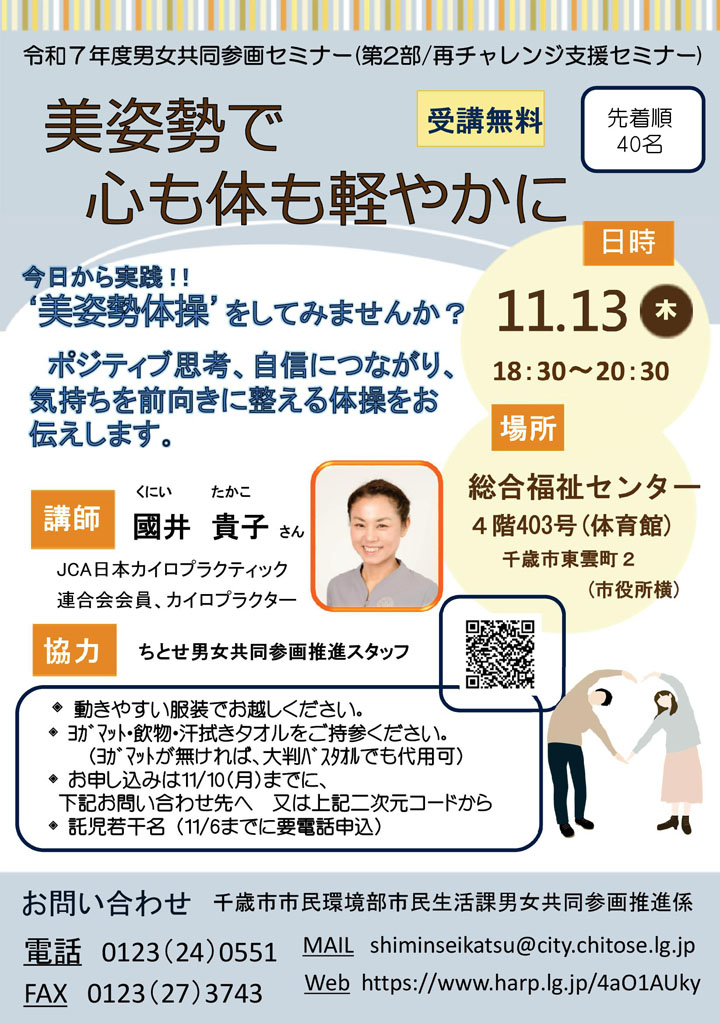 市民生活課男女共同参画推進係 電話:0123-24-0551 FAX:0123-27-3743 Mail: shiminseikatsu@city.chitose.lg.jp Web申込https://www.harp.lg.jp/4aO1AUky |
