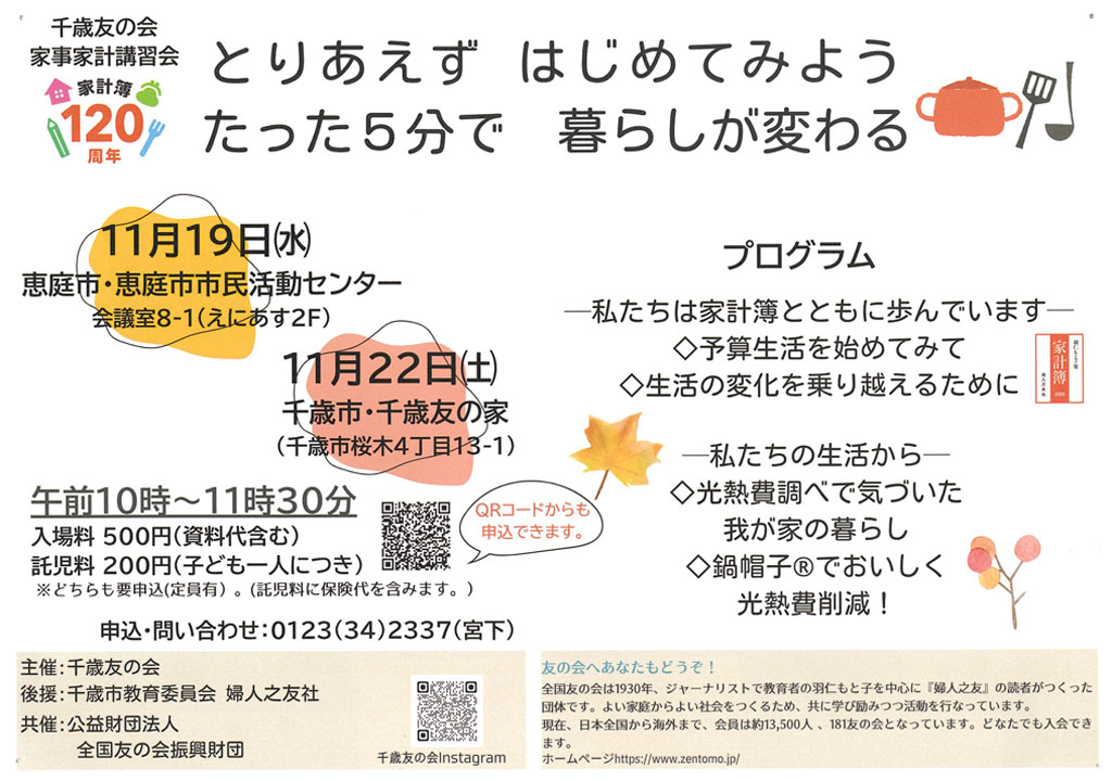 【入場料】 500円(資料代含む)◇予算生活を始めてみて ◇生活の変化を乗り越えるために -私たちの生活から- ◇光熱費調べで気付いた我が家の暮らし ◇鍋帽子®でおいしく光熱費削減! 【託児料】 200円(保健代含む) 【申込・問合せ】 【主催】 千歳友の会 Instagram