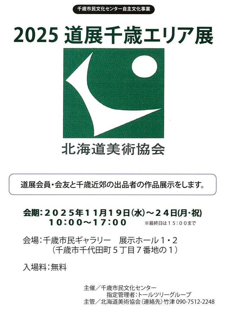 | 詳細: | 道展会員・会友と千歳近郊の出品者の作品展示をします。 【入場料】 無料 【主催】 千歳市民文化センター (指定管理者:トールツリーグループ) 【主管】 北海道美術協会  |