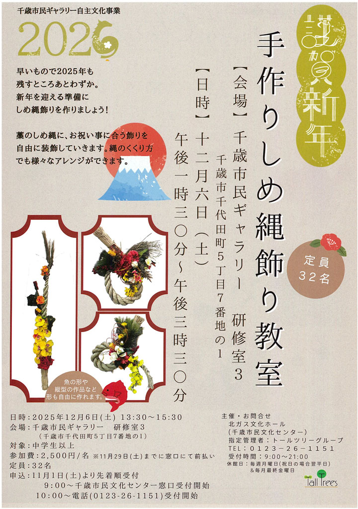 | 詳細: | 藁のしめ縄に、お祝い事に合う飾りを 自由に装飾していきます。 縄のくくり方 でも様々なアレンジができます。 【対象】 中学生以上 【定員】 32名(先着順) 【参加費】 2,500円/名 【申込】 11/1(土)より受付 千歳市民文化センター窓口 9:00~ 電話(0123-26-1151) 10:00~ ※詳しくは主催者WEBページ(リンク)へ 【主催】 北ガス文化ホール (千歳市民文化センター) 指定管理者:トールツリーグループ  |