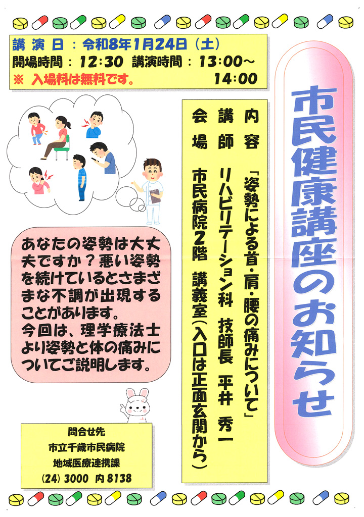 | 詳細: | あなたの姿勢は大丈夫ですか? 悪い姿勢を続けていると様々な不調が出現することがあります。 今回は、理学療法士より姿勢と体の痛みについて説明します。 【講師】 リハビリテーション科 技師長 平井 秀一 氏 【入場料】 無料 【問合せ】 市立千歳市民病院 地域医療連携課 電話:0123-24- 3000 内線8138 |