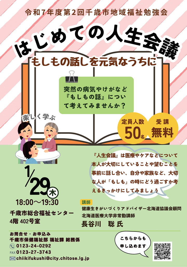 | 詳細: | 突然の病気やけがなど『もしもの話』について考えてみませんか? 『人生会議』は医療やケアなどについて本人が大切にしていることや望むことを事前に話し合い、自分の家族など、大切な人が「もしも」の時にどう過ごすか考えるきっかけにしてみましょう。 【講師】 長谷川 聡 氏