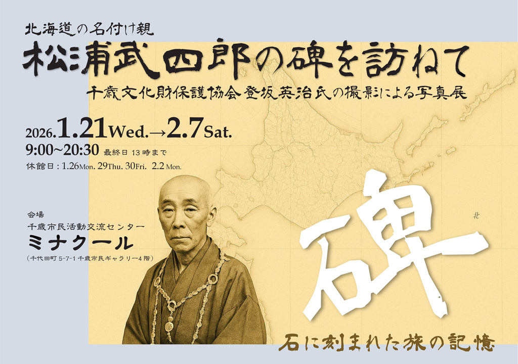 | 詳細: | 千歳文化財保護協会 登坂英治氏の撮影による写真展 【入場料】無料 |