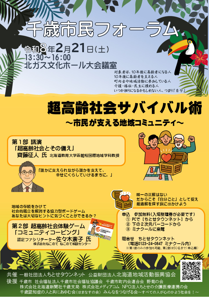 【参加費】 無料 (要整理券)●町内会や地域活動に参加している人 ●介護・福祉・民生に携わる人 ●いつか独りになるかもしれない人 その他、興味のある方はどなたでもOK 【定員】 50名程度 【参加申込】 整理券を配布いたしますので下記へ ●ミナクール(受付または電話 0123-24-0847) ●ウェブ 市民フォーラム申込フォーム 【問合せ】 一般社団法人ちとせタウンネット