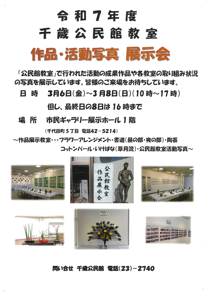 | 詳細: | 公民館教室で行われた活動の成果作品や各教室の取り組み状況の写真を展示しています。 皆様のご来場をお待ちしています。 ■作品展示 フラワーアレンジメント、書道(昼・夜の部) 陶芸、コットンパール、いけばな(草月流) 公民館教室活動写真 【問合せ】 千歳公民館 電話:0123-23-2740 |