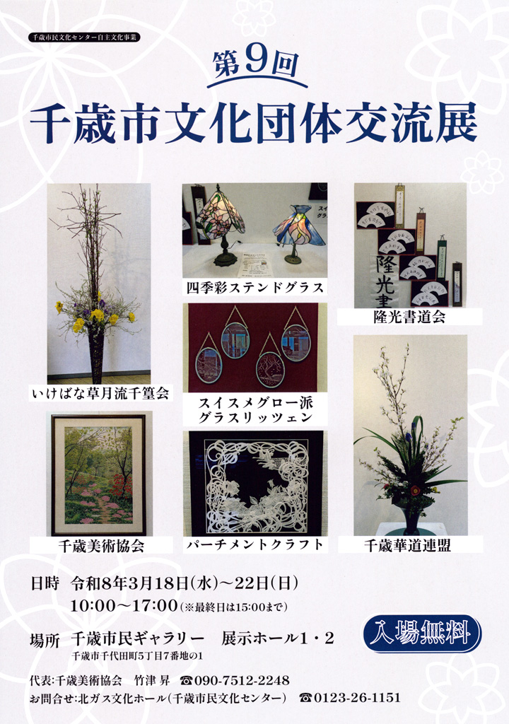 【入場料】 無料●四季彩ステンドグラス ●隆光書道会 ●千歳美術協会 ●スイスメグロー派グラスリッツェン ●パーチメントクラフト ●千歳華道連盟 【主催・問合せ】 北ガス文化ホール(TEL:0123-26-1151) |