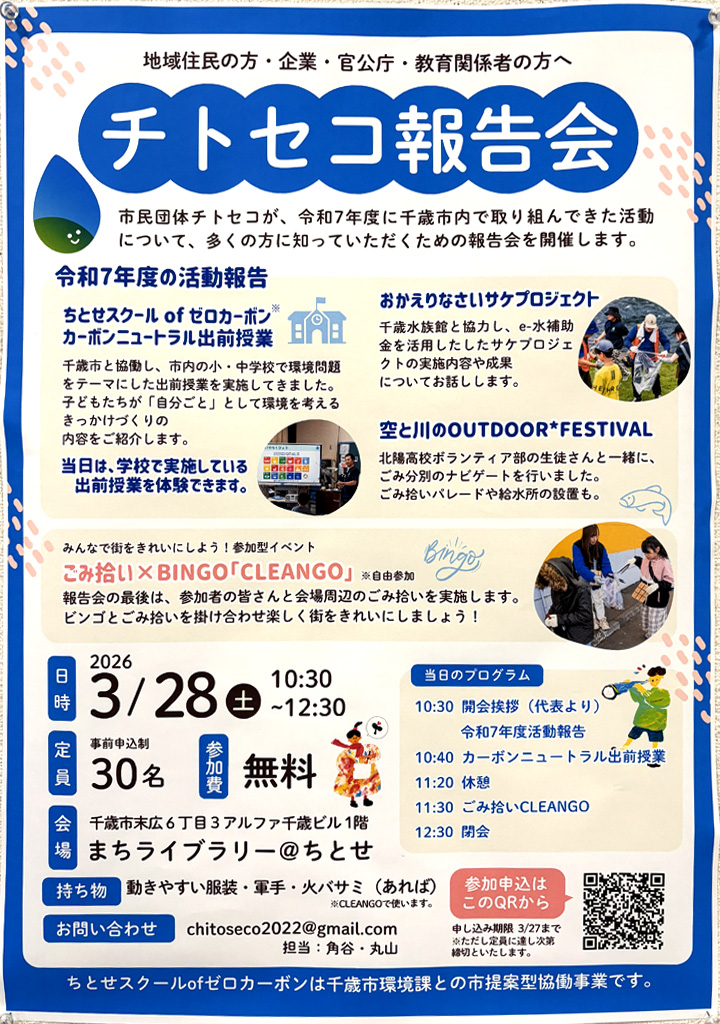 | 詳細: | 市民団体チトセコが、令和7年度に千歳市内で取り組んできた活動について、多くの方に知っていただくため報告会を開催します。 ※詳しい内容等は、ポスターイメージをクリックして ご覧ください 【定員】 30名 【参加費】 無料 【持ち物】 動きやすい服装・軍手・火ばさみ(あれば) 【参加申込】 3月27日まで (定員になり次第締切) QRコードから申込 ![]() 【問合せ】 チトセコ担当: 角谷・丸山 メール:chitoseco2022@gmail.com |