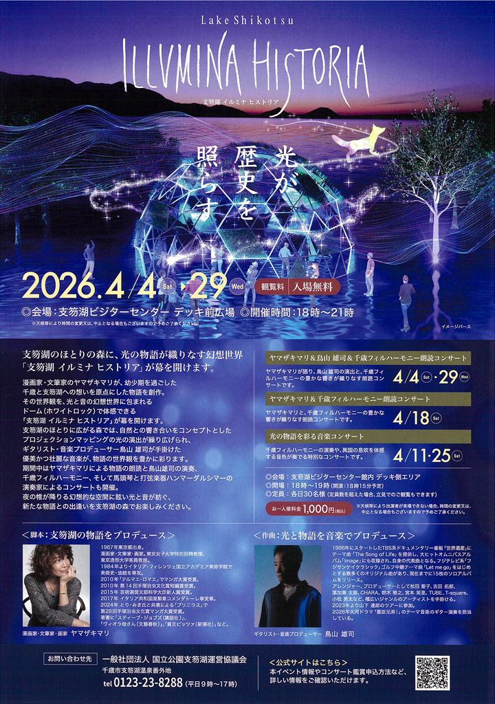 | 詳細: | 『光が歴史を照らす』 支笏湖のほとりの森に、光の物語が織りなす幻想世界「支笏湖イルミナヒストリア」が幕を開けます。 【観覧料】 無料 【コンサート】 (有料) ■ヤマザキマリ&鳥山雄司
